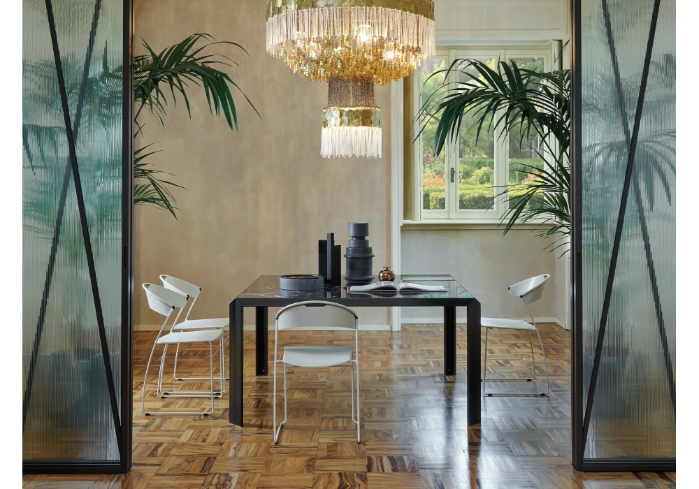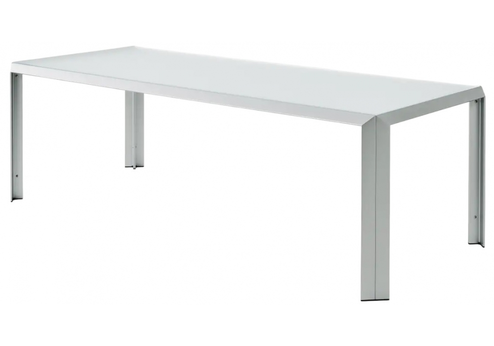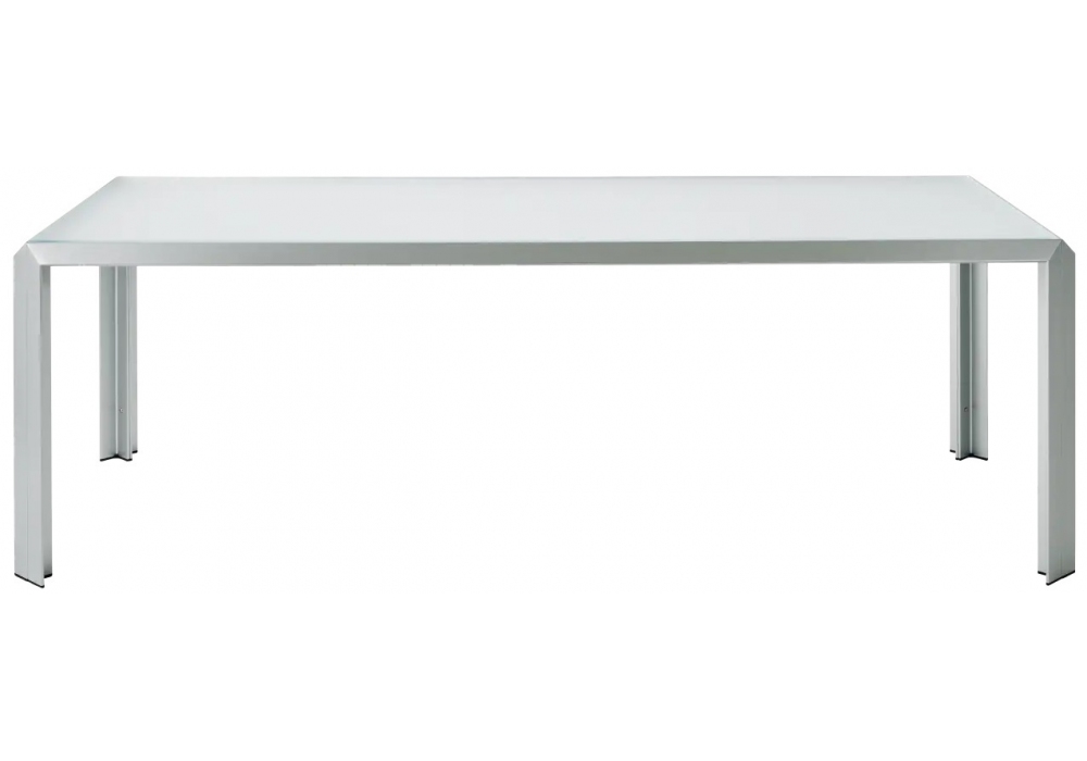 T-Table von Angelo Mangiarotti für Baleri Italia entworfen, ist ein Tisch mit einer Struktur aus stranggepressten Aluminiumprofilen, lackiert in den angegebenen Farben. Die bündig in die Struktur eingesetzte Platte mit abgeschrägten Kanten ist erhältlich aus transluzentem, geätztem oder getöntem, geätztem Einscheibensicherheitsglas (12 mm dick), aus Carrara-Marmor, Marquina, Tundra Grey oder Taj Mahal-Quarzit (20 mm dick). Schwarze Polyethylenfüße. Verfügbar in verschiedenen Abmessungen.