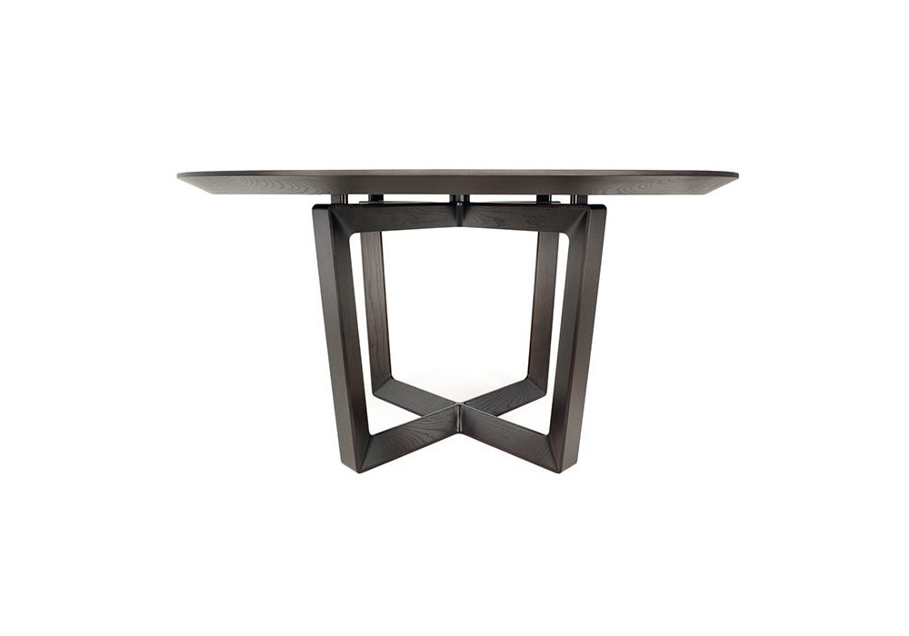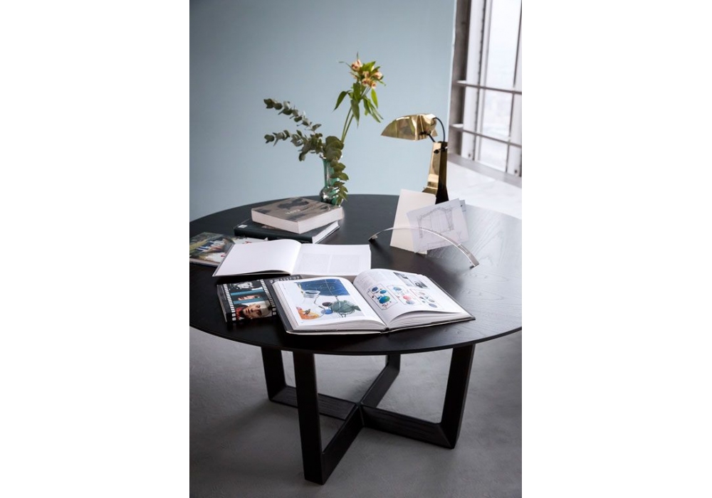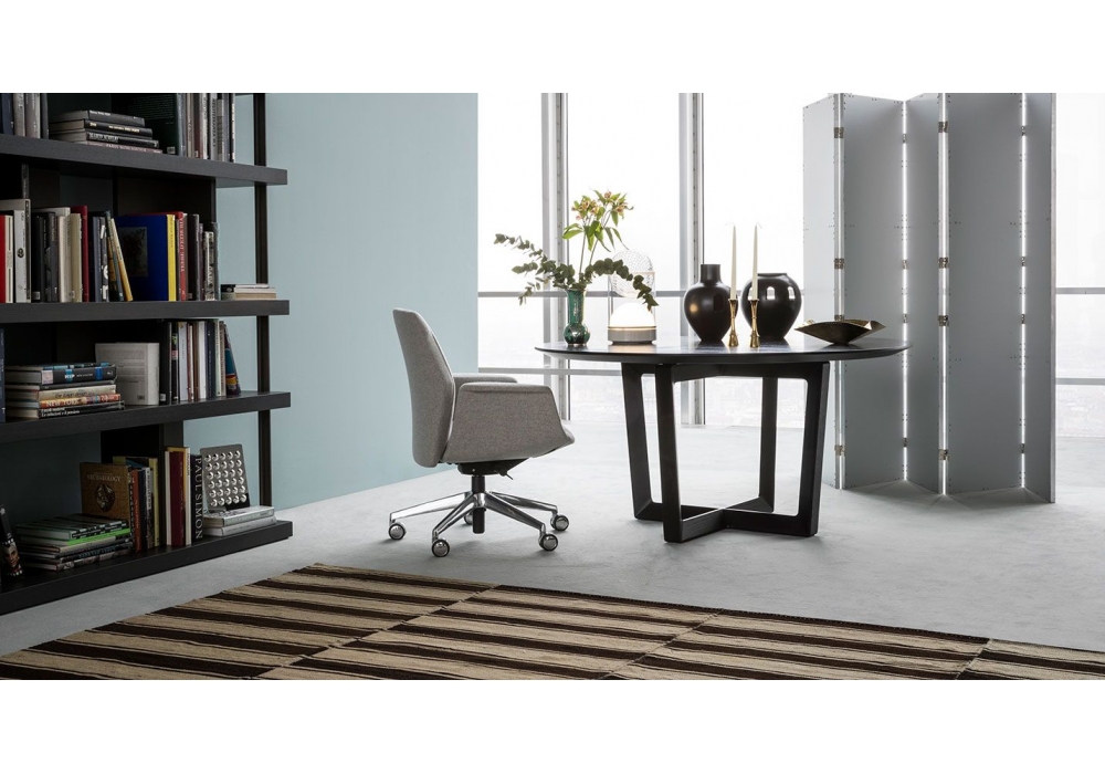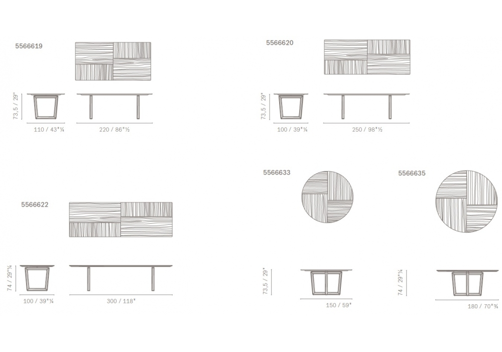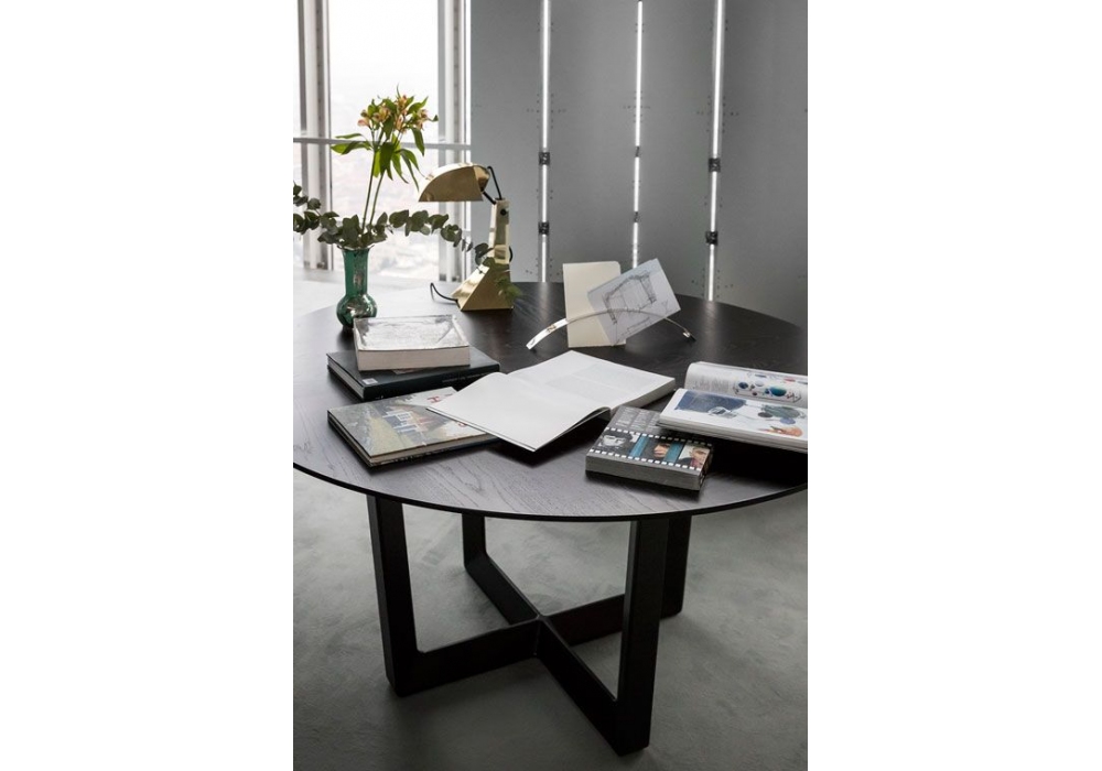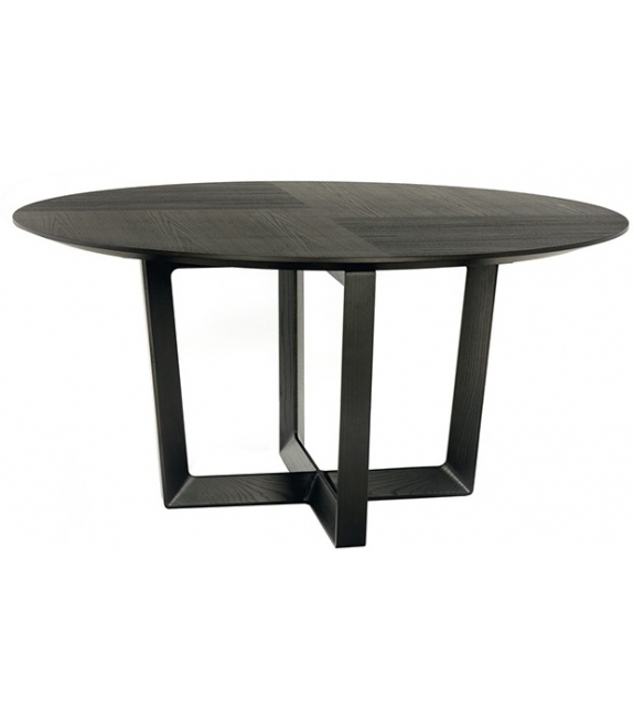 Poltrona Frau Bolero tisch: Das Gestell der Tische besteht aus wengéholzfarbener Massivesche oder aus massivem Canaletto Nussbaum mit dreieckigem Profil. Die Verankerungsplatten und die Abstandstücke sind aus schwarz lackiertem Stahl. Schutzkappen aus Kunststoff. Die Tischplatte ist auf der Oberseite mit wengéholzfarbener Messerfurnier aus Esche oder Canaletto Nussbaum mit charakteristischer Intarsienverarbeitung mit „Überkreuz“-Maserungen. Rundum-Holzbesatz aus wengéholzfarbener Massivesche oder aus Canaletto Nussbaum, Unterteil mit ausgleichendem Furnier. Die 220x110cm und 250x100cm großen Tische und die runde Version (ø150) sind auch mit Platte aus Calacatta Oro-Marmor mit abgerundeter Kante und Halbglanzoder Polyesterglanzfinish erhältlich. Bei der Version mit Halbglanzfinish ist die Marmorplatte auf der Oberfläche mit einer wasserabweisenden Schutzlösung behandelt, die ihr ein natürliches Aussehen verleiht. Beim Glanzfinish wird hingegen ein transparenter Polyesterlack aufgetragen, der die Oberfläche beständiger macht und ein Eindringen von Flüssigkeiten verhindert. Die stützende Unterplatte besteht aus lackiertem Multischicht-Birkenholz mit texturierter mattschwarzer Antikratzlackierung. Bei den Versionen aus Marmor sind die Tischbeine aus wengéholzfarbener Esche oder aus Canaletto Nussbaum. Die runde Version (ø180) ist auch mit der Drehplatte Lazy Susan erhältlich, die nicht an der Hauptplatte befestigt ist, sondern nur aufliegt. Sie besteht aus zwei zusammengebauten, runden Platten unterschiedlichen Durchmessers: Die obere (ø115) besteht aus Multischicht-Birkenholz mit Rundum-Holzbesatz aus wengéholzfarbener Massivesche oder aus massivem Canaletto Nussbaum mit derselben Verarbeitung wie bei der Hauptplatte und ausgleichendem Furnier im unteren Bereich. Die kleinere Unterplatte ist aus MDF mit schwarzer Antikratzlackierung und Filzdämpfern. Zwischen den beiden Platten ist ein Drehmechanismus auf Stahlkugeln angebracht.
