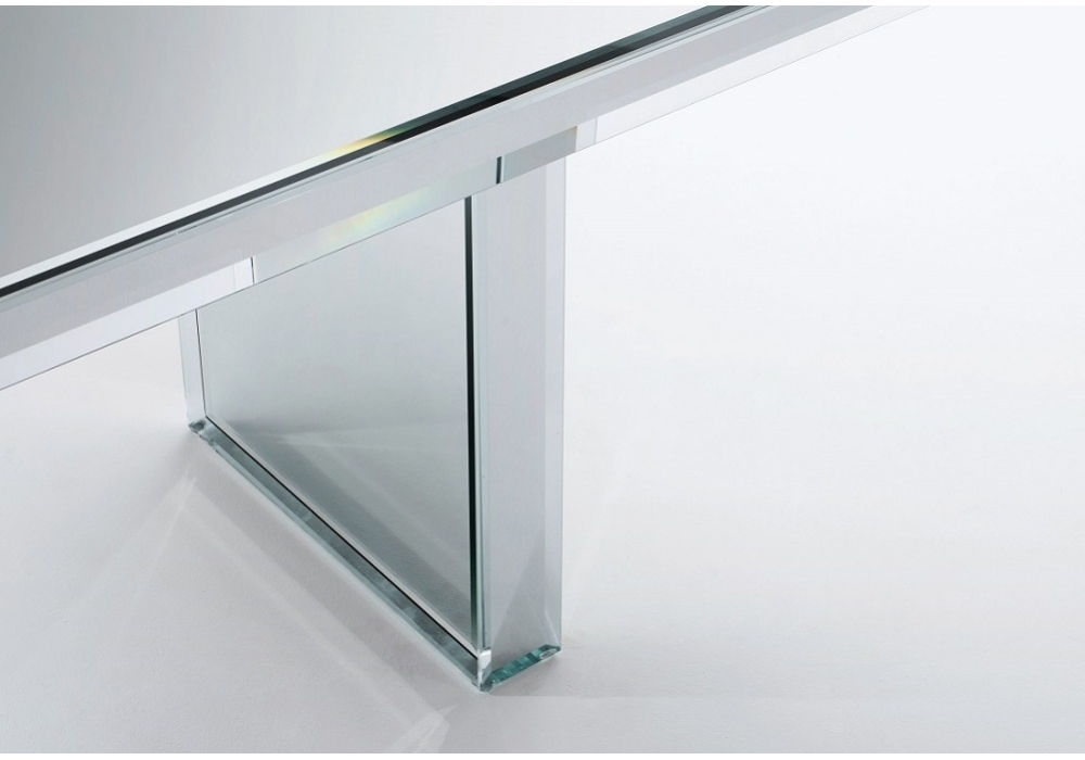 Prism Mirror Table von Tokujin Yoshioka für Glas Italia entworfen, ist ein Tisch aus 12 mm versilbertem transparentem extralight Glas. Die Sockel werden mit Metallplatten und Schrauben an der Oberseite befestigt.