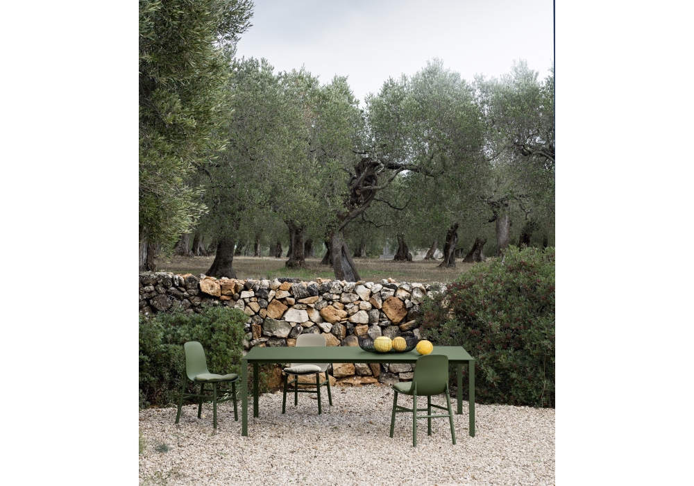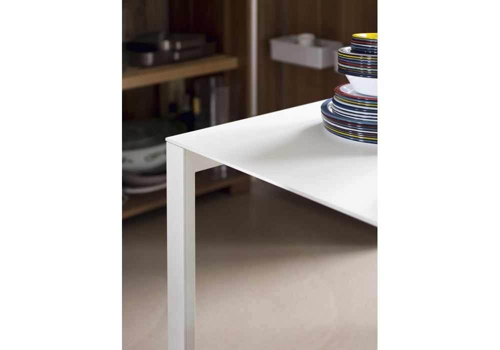 Thin-K von Luciano Bertoncini für Kristalia entworfen, ist eine Tischkollektion, die in fester oder ausziehbarer Version erhältlich ist. Beine aus lackiertem Stahl, Top-Finish, äußere Details an Bein und Verlängerung aus lackiertem Aluminium.