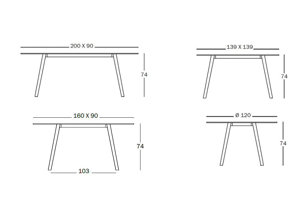 | Abmessungen | Ø 120 x H 74 cm; 139 x 139 x H 74 cm; 160 x 90 x H 74 cm; 200 x 90 x H 74 cm. |