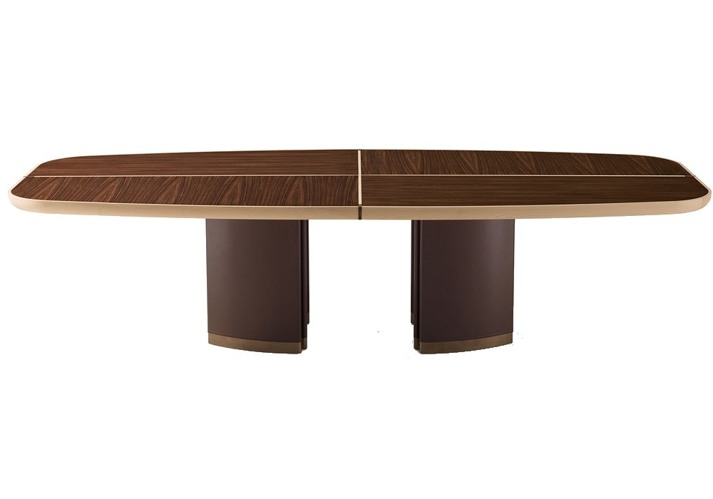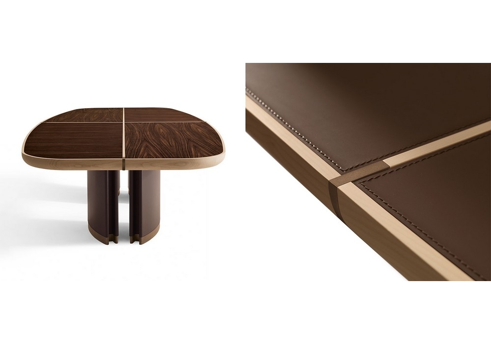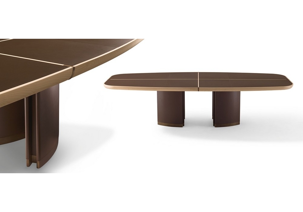 Gordon is a rectangular table designed by Roberto Lazzeroni for Giorgetti. Table with the structure and the dividers of the top in solid maple. The top is in poplar plywood with inserts available in indian rosewood, Rain Forest Brown marble and saddle leather. The columns are in mdf covered with saddle leather and the profiles of the bases, as well as the top inserts, are painted in a bronze colour with natural effect.