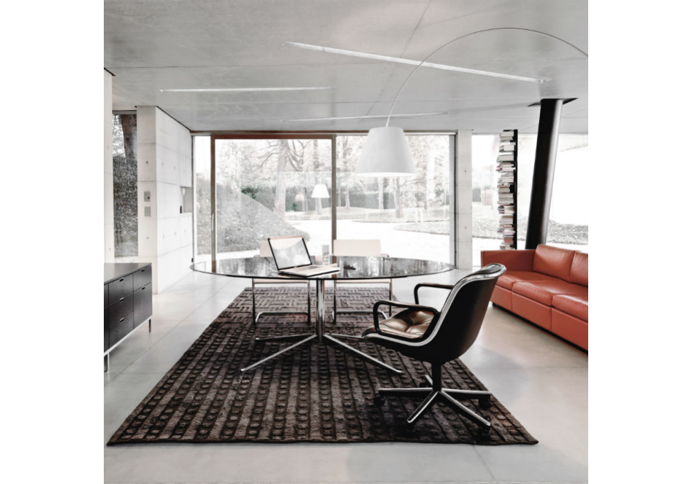 Florence, von Florence Knoll für Knoll entworfen, ist ein ovaler Schreibtisch mit einem verchromten oder polierten Stahlgestell und einer Platte aus Marmor, Laminat oder Holz in verschiedenen Ausführungen.