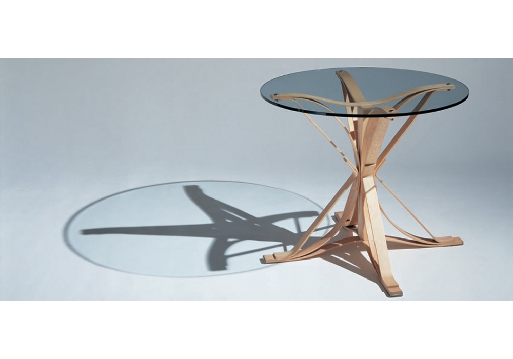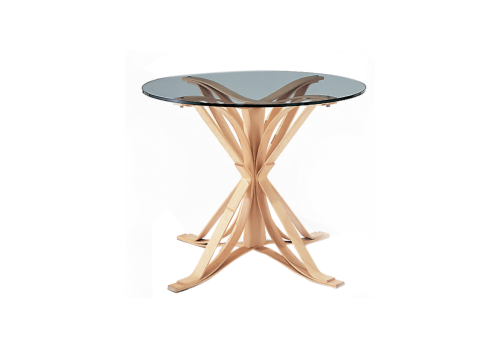 Face Off von Frank Gehry für Knoll entworfen ist ein Tisch mit einer Struktur aus natürlichen Ahornstreifen mit transparenten Kunststofffüßen mit mattem Finish. Platte aus gehärtetem Glas oder weißem Laminat mit fester Kante. Verfügbar in zwei Größen.