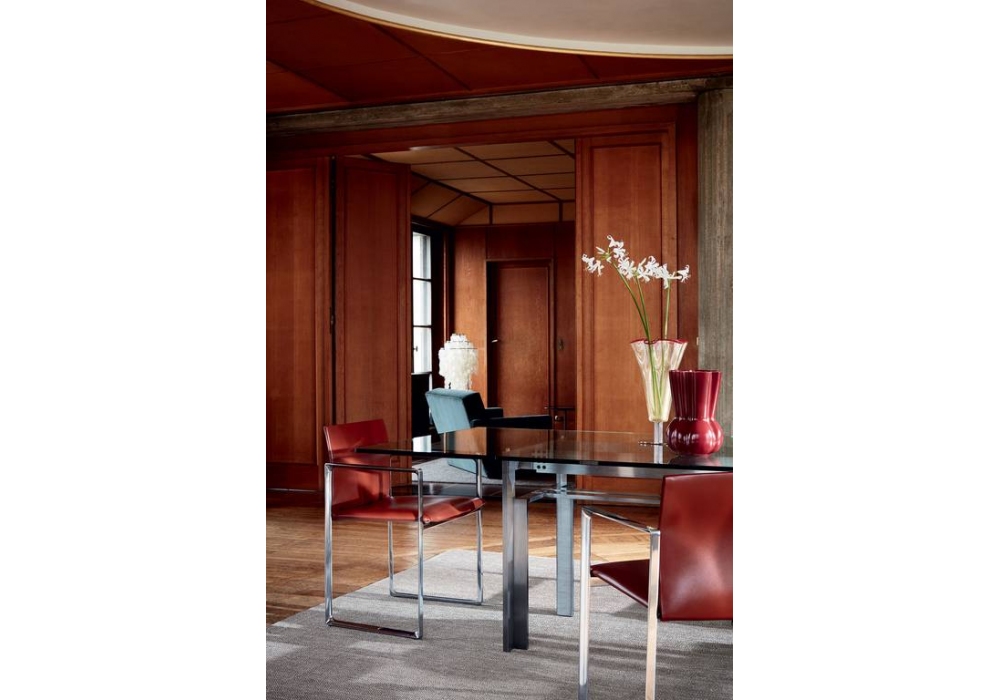 Doge von Carlo Scarpa für Cassina entworfen, ist ein Tisch mit einem Stahl- oder Aluminiumgestell und einer Glas- oder Marmorplatte. Verfügbar in mehreren Ausführungen und Abmessungen.