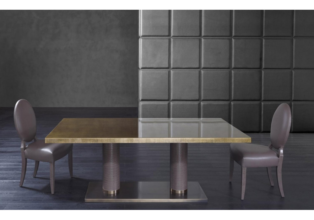 Fujico von Rugiano entworfen, ist ein rechteckiger Tisch mit Struktur in Bronze- oder Chromausführung und Platte aus Marmor oder mit Leder bezogen. Erhältlich in verschiedenen Abmessungen.