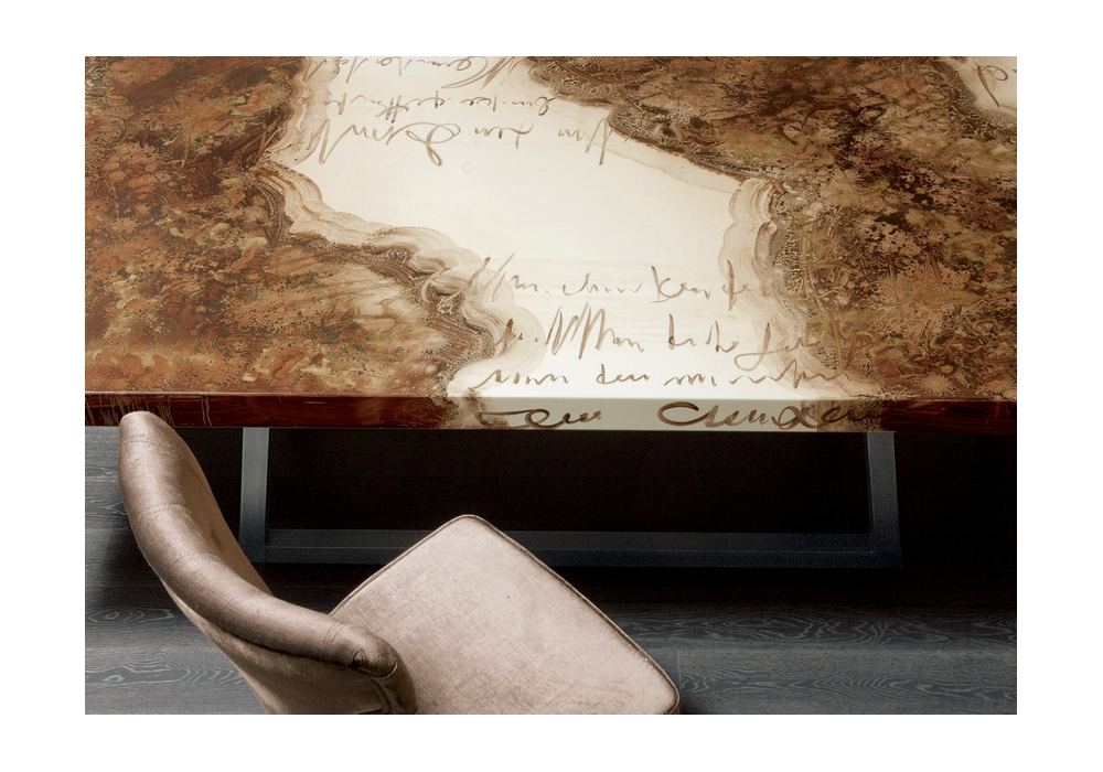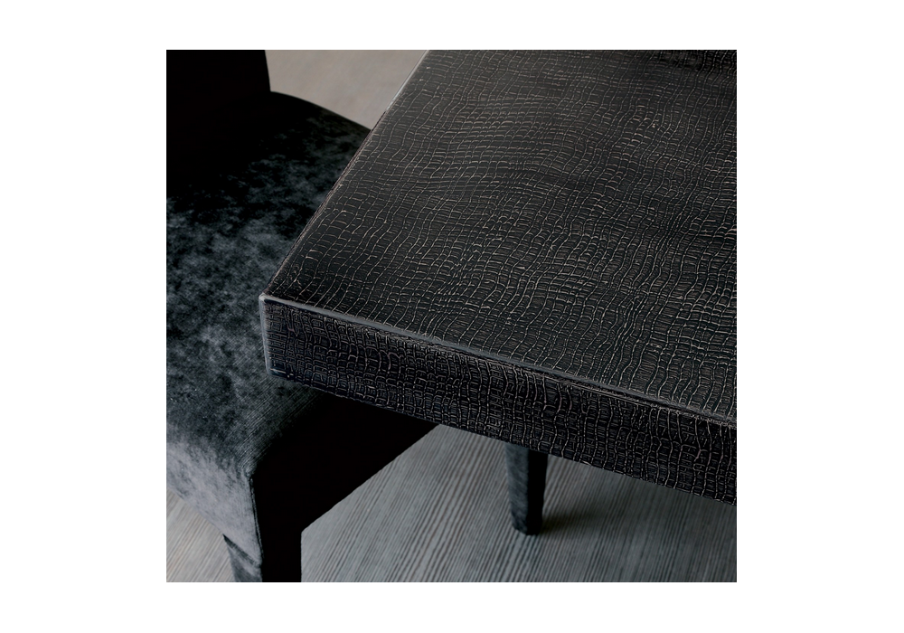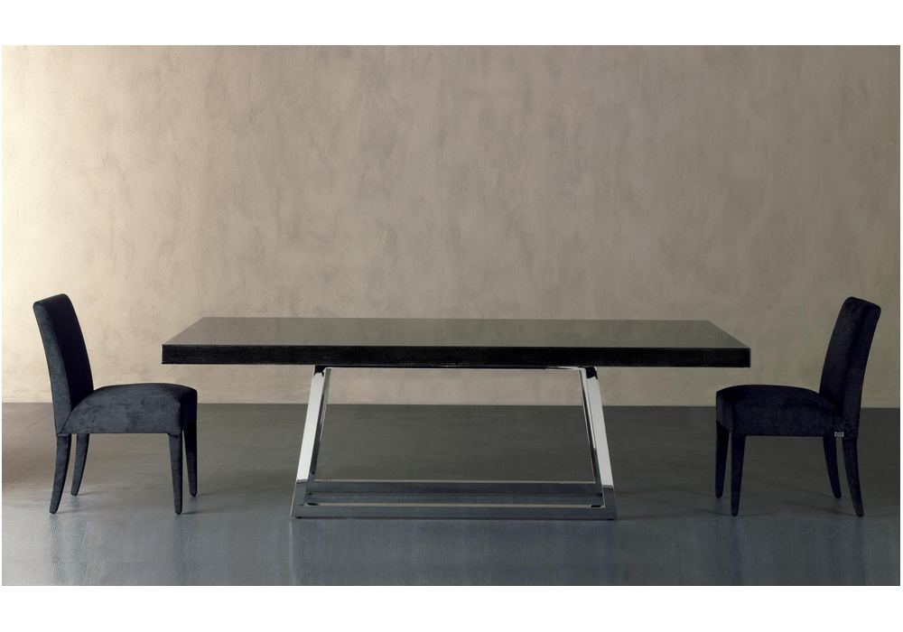 Decoro von Rugiano entworfen, ist ein Tisch mit Platte, der in verschiedenen Größen und Materialien mit verschiedenen Oberflächen erhältlich ist und sich durch Details aus bronziertem Messing oder Chrom auszeichnet.