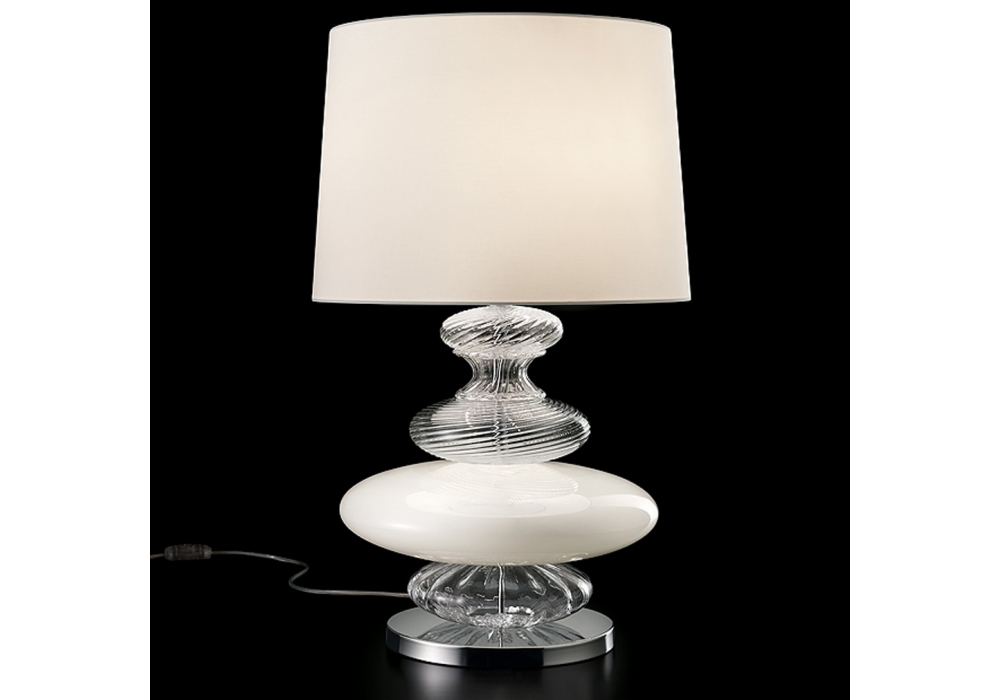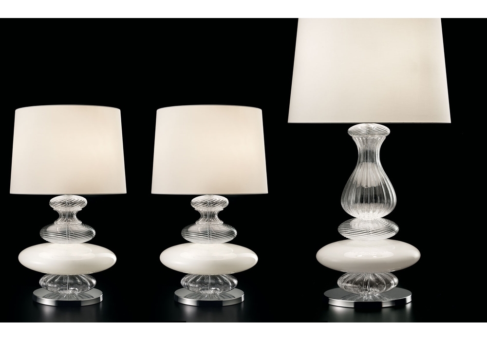 Pigalle entworfen und hergestellt von Barovier & Toso ist eine Tischleuchte mit kreisförmigem Sockel und einer Metalltragstruktur. Der Lampenkörper besteht aus venezianischem Glas, während der Lampenschirm aus Stoff besteht und eine dimmbare LED- oder Halogenlichtquelle abschirmt. Pigalle ist in verschiedenen Modellen und Ausführungen erhältlich.