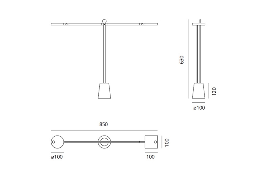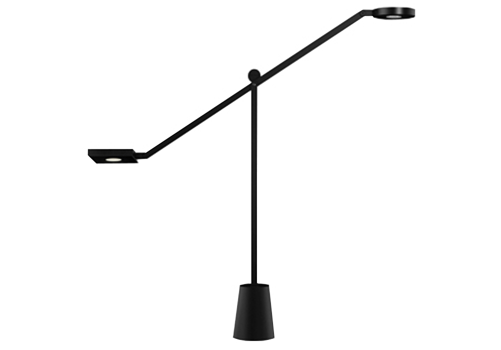 Equilibrist von Jean Nouvel für Artemide entworfen ist eine Tischleuchte mit konischem Sockel aus Zamak und röhrenförmigen Schwingarmen aus schwarz lackiertem Aluminium. Die Diffusoren sind an den Scheitelpunkten einander gegenüberliegend mit LED-Lichtquellen mit dimmbarem System ausgestattet.