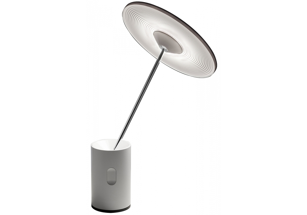 Sisifo von Scott Wilson für Artemide entworfen ist eine Tischleuchte mit einem zylindrischen Sockel aus weißem Aluminium und einer neigbaren Stange aus verchromtem Messing. Der Lampenschirm ist kreisförmig aus weißem Aluminium mit einem Methacrylat-Diffusor und schirmt eine dimmbare LED-Lichtquelle ab.