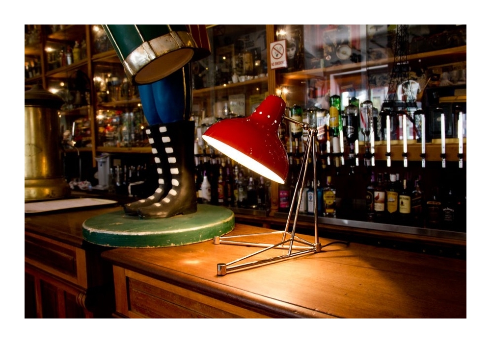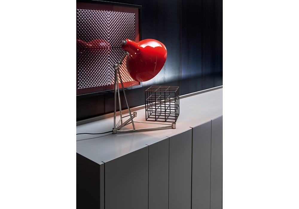 Diana, entworfen von DelightFULL, ist eine handgefertigte Tischlampe aus Materialien wie Messing und Aluminium. Für den Körper wurde Messing verwendet, während für den Lampenschirm Aluminium gewählt wurde. Der Aluminiumschirm ist außen glänzend rot und innen matt weiß lackiert, während für den Korpus eine vernickelte Oberfläche gewählt wurde.