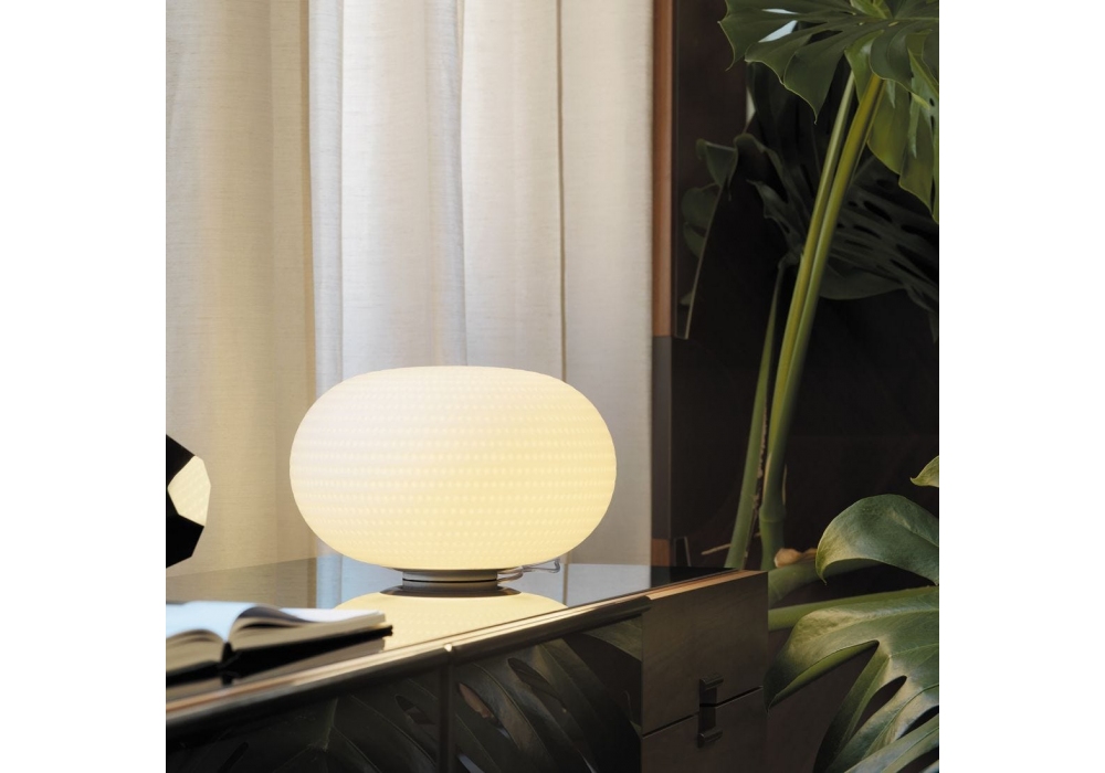 Bianca von Matti Klenell für Fontana Arte entworfen, ist eine Tischleuchte mit Diffusor aus milchig weißem, geblasenem und satiniertem Schichtglas. Sockel aus lackiertem Metall. Transparentes Netzkabel, Stecker und Schalter.
