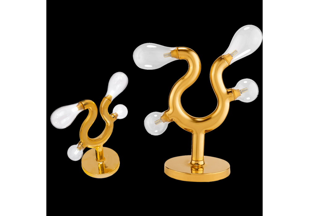 The Four Bulb von Matteo Cibic für Scarlet Splendor entworfen ist eine warmweiße LED-Tischleuchte. Es besteht aus Keramik mit 24-Karat-Gold-Finish und mundgeblasenem Glas.