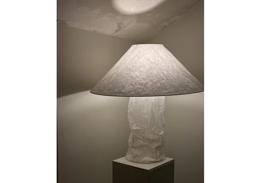 Lampampe, entworfen und hergestellt von Ingo Maurer, ist eine Tischleuchte aus japanischem Papier und Metall. Das charakteristische Design der Lampe ist der zerknitterte Effekt des Papiers.