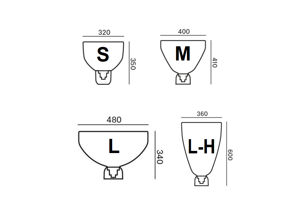 | Abmessungen | Ø 32 x H 35 cm; Ø 40 x H 41 cm; Ø 48 x H 34 cm; Ø 36 x H 60 cm |