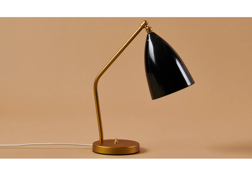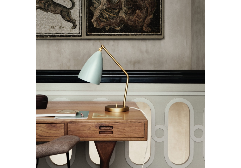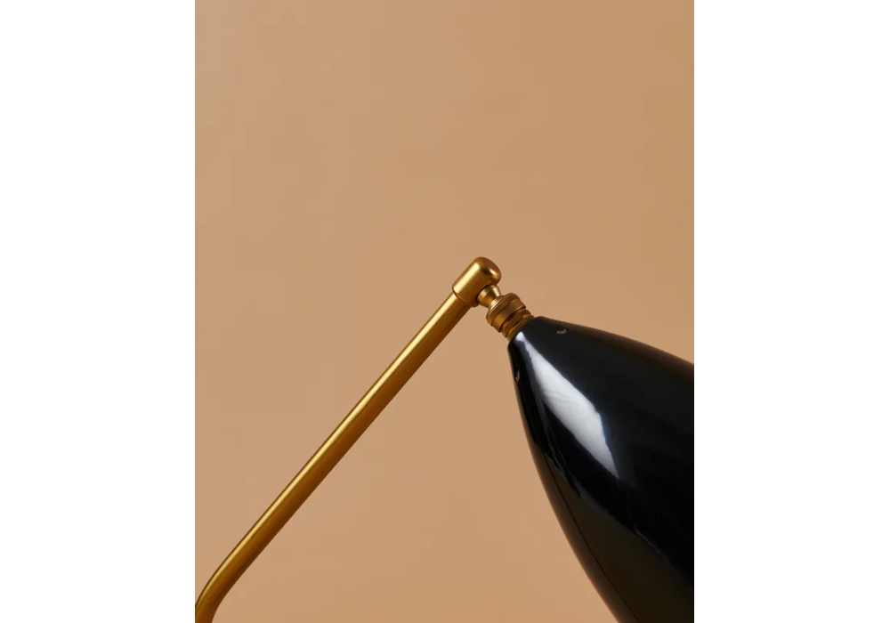 Gräshoppa, von Greta M. Grossman für Gubi entworfen, ist eine Tischlampe mit Messingrohrständer. Der Schirm kann gekippt und um 360° gedreht werden. Birne nicht enthalten. Verfügbar in verschiedenen Ausführungen.
