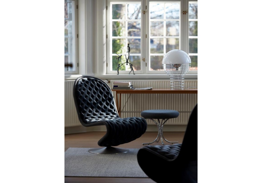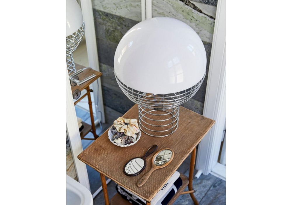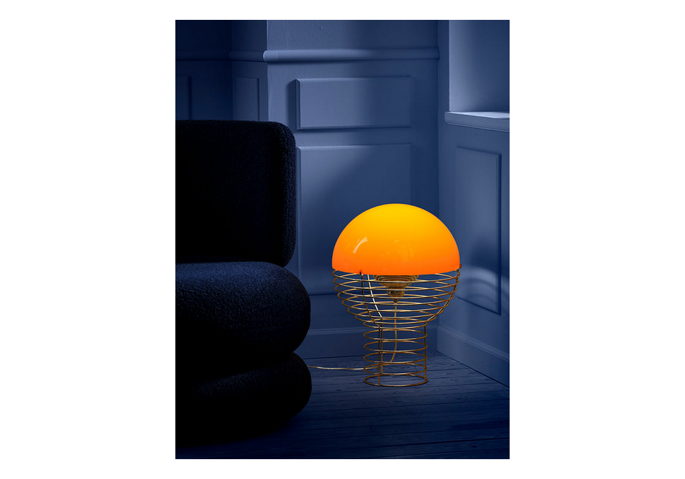 Wire von Verner Panton für Verpan entworfen, ist eine Tischleuchte mit einer zylindrischen Metalldrahtstruktur, die sich oben zu einer Halbkugel erweitert. Halbkugelförmiger Lampenschirm aus weißem oder orangefarbenem Kunststoff. Am Netzkabel befindet sich ein transparenter Ein-/Ausschalter.