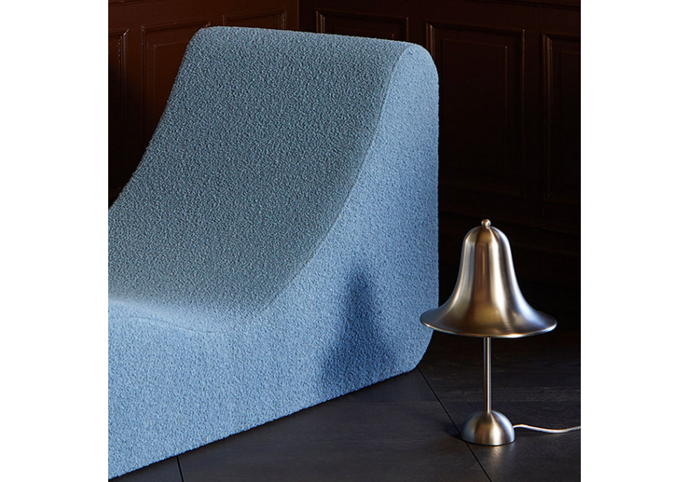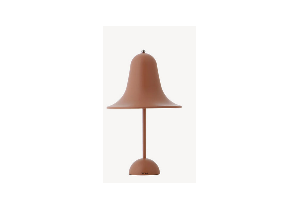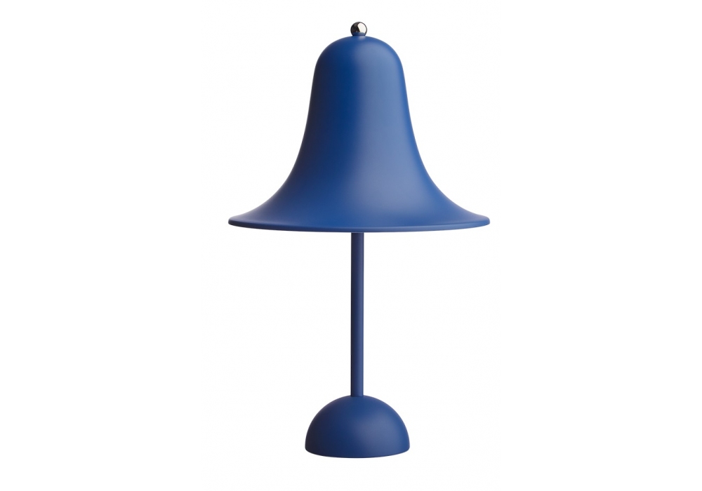 Pantop von Verner Panton für Verpan entworfen, ist eine Tischleuchte aus Metall, die sich durch einen ausgestellten glockenförmigen Lampenschirm auszeichnet, der mit der Öffnung nach unten montiert ist. Polierte Versionen haben eine verchromte obere Schraube. Verfügbar in mehreren Ausführungen.