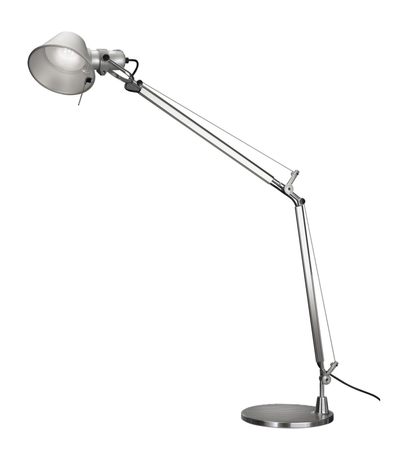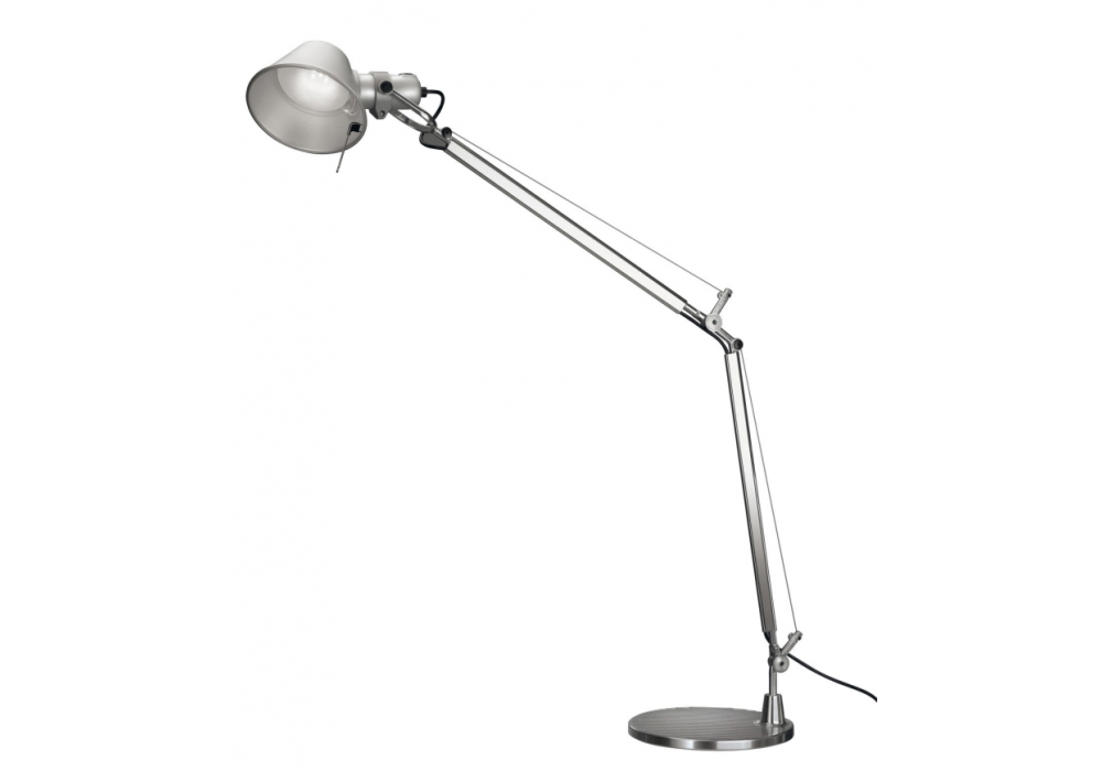 Tolomeo Mini entworfen von Michele De Lucchi und Giancarlo Fassina für Artemide ist eine Tischleuchte mit rundem Stahlsockel und beweglichen Aluminiumarmen. Der Kopf hat eine bewegliche Kreisform und verfügt über eine LED-Lichtquelle. Tolomeo Mini ist in verschiedenen Ausführungen und Ausführungen erhältlich.