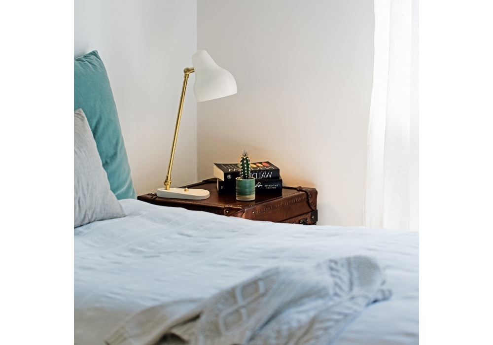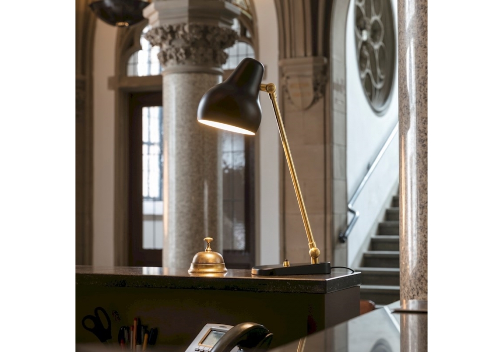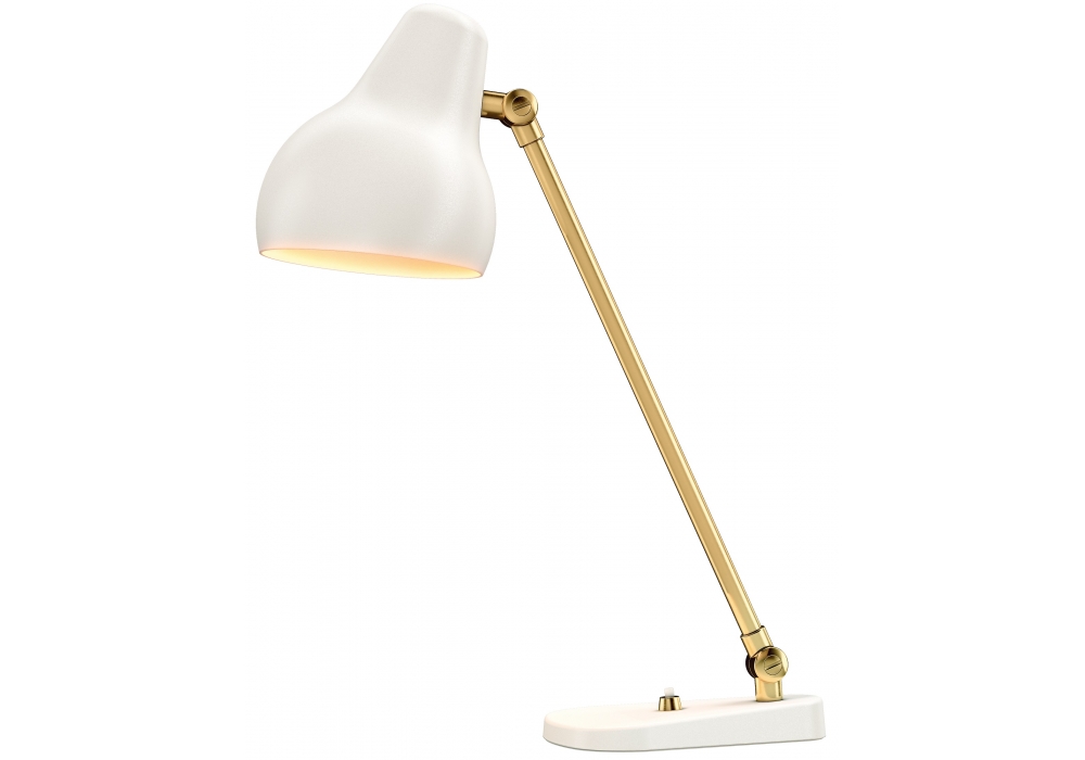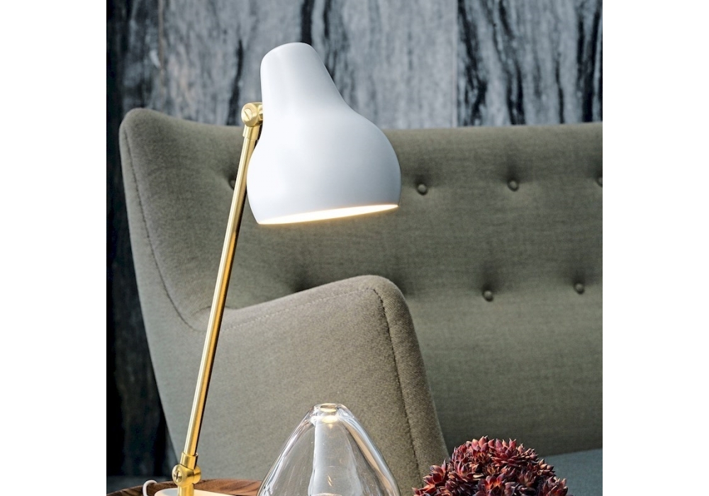 VL38 von Vilhelm Lauritzen für Louis Poulsen entworfen, ist eine Tischlampe mit Sockel aus lackiertem Aluminiumdruckguss und Stab aus gebürstetem Messing. Der Diffusor besteht aus lackiertem Aluminium und schirmt eine LED-Lichtquelle ab, die von einem Kunststoffkabel mit Ein-/Ausschalter gespeist wird. VL38 ist in verschiedenen Ausführungen erhältlich.