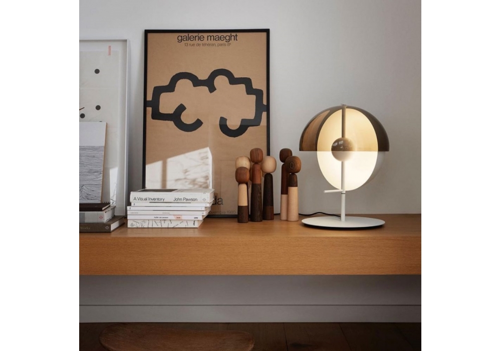 Theia M von Mathias Hahn für Marset entworfen, ist eine Tischleuchte mit Sockel und Stiel aus lackiertem Eisen. Diffusor aus lackiertem Aluminium mit eingebautem Schalter. Vertikale Halbkugel aus lackiertem Metall mit Innenraum in Weiß und einem transparenten Rauchfarbton aus thermogeformtem Methacrylat. Auch verfügbar in 2 verschiedenen Ausführungen: weiß oder schwarz.