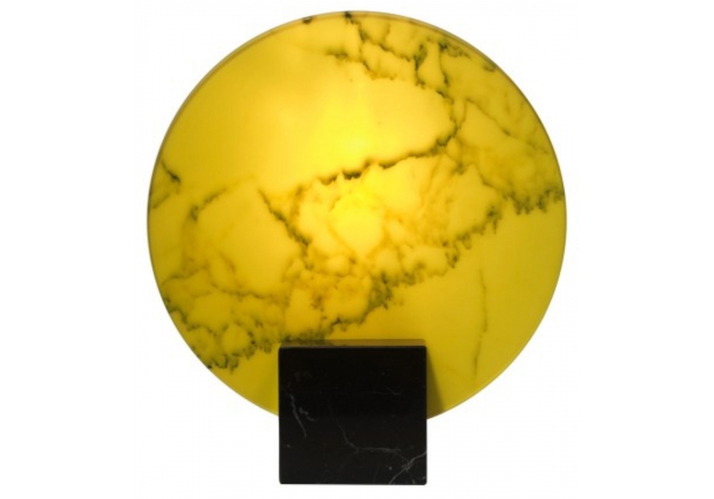 Acid Marble, von Lee Broom entworfen, ist eine Tischleuchte mit einer Schicht aus weißem Carrara Marmor und säuregelb getönten Glas, sandwiched zusammen, um einen beleuchteten kreisförmigen Diffusor zu bilden. In eine solide schwarze nero marquina Marmorbasis setzen die Adern des Carrara-Marmors durch das Glas sichtbar, so dass der Marmor gelb erscheinen kann, was diesem klassischen Material eine verspielte Torsion verleiht.