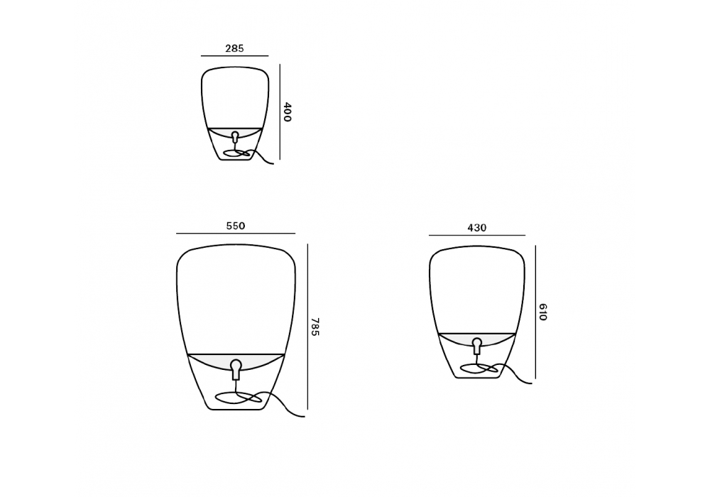 | Abmessungen | 28.5 x H 40 cm; 43 x H 61 cm; 55 x H 78.5 cm. |
