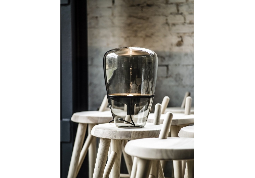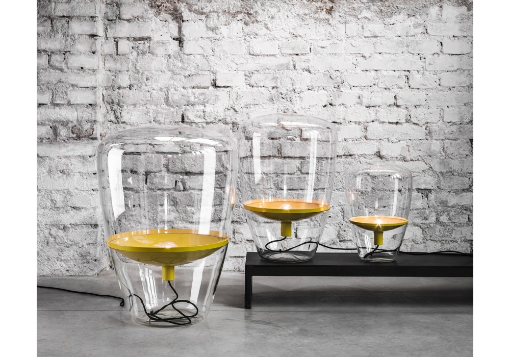 Balloons von Dan Yeffet & Lucie Koldova für Brokis entworfen, ist eine Tisch-/Stehleuchte mit transparentem oder getöntem Glasschirm. Der innere Reflektor ist aus lackiertem oder naturbelassenem Metall in verschiedenen Ausführungen erhältlich. Als Lichtquelle dient eine LED, die über ein Textilkabel mit Strom versorgt wird.