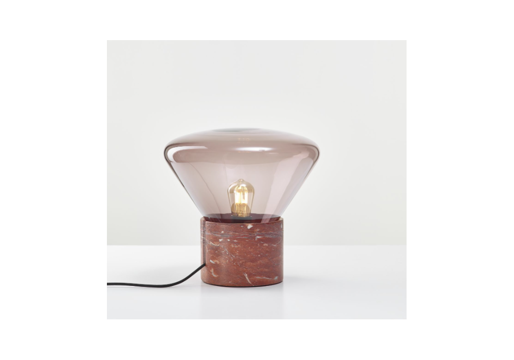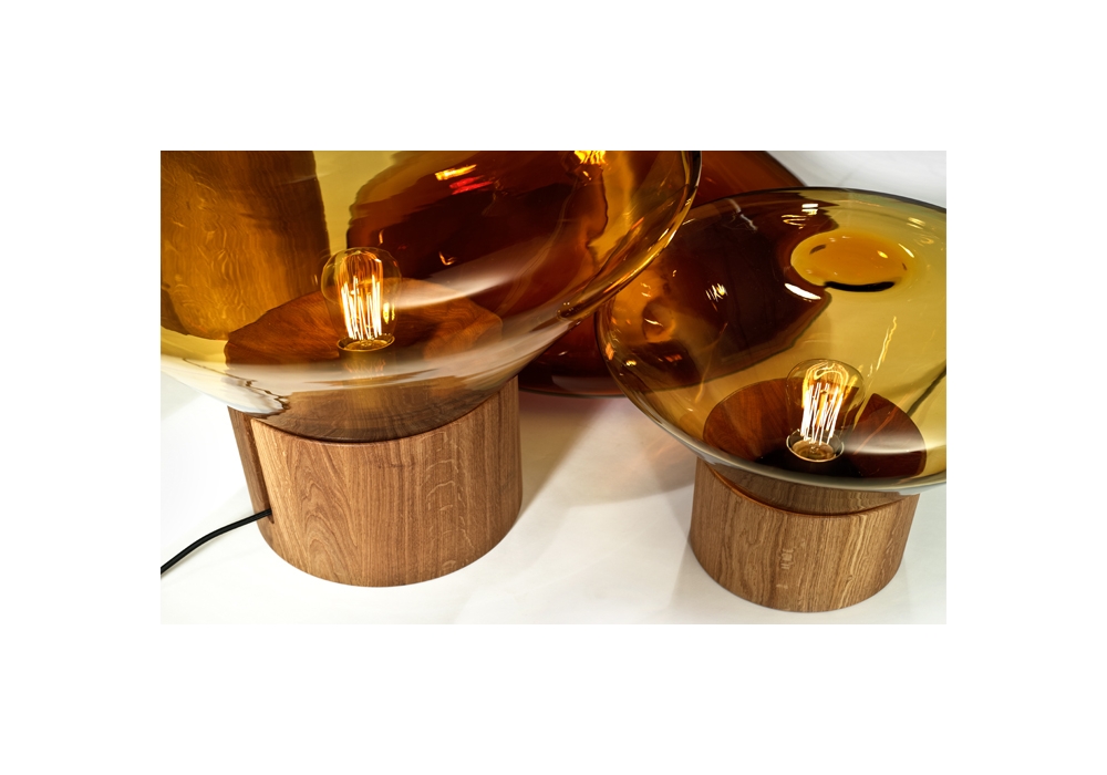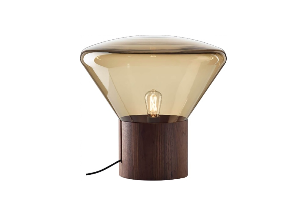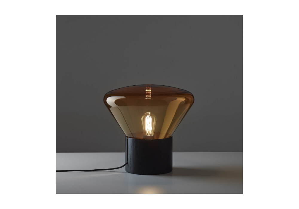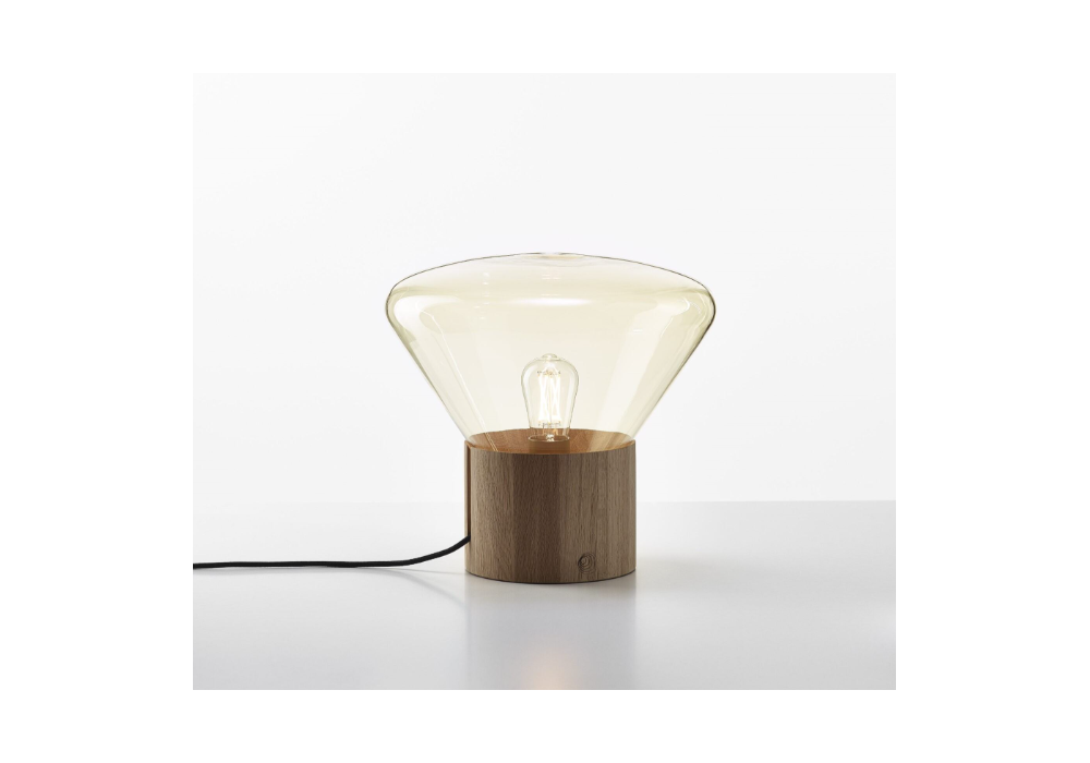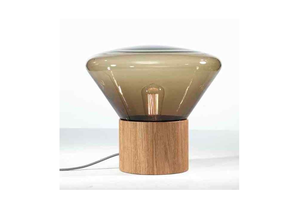 Muffins Wood 01 von Dan Yeffet und Lucie Koldová für Brokis entworfen, ist eine Tisch-/Stehlampe mit Diffusor aus schattiertem Glas in verschiedenen Farben. Die Basis hat eine zylindrische Form in verschiedenen Ausführungen aus behandeltem oder natürlichem Holz. Die gewählte Lichtquelle ist vom dimmbaren LED-Typ.