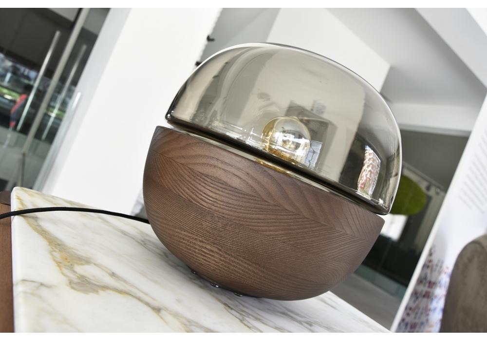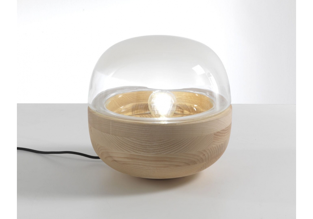 Bolla, von C. Favaretto für Porada entworfen, ist eine Tischlampe mit Gestell aus massiver Esche und Lichtzerstreuer aus milchweißem Glas oder Rauchglas.