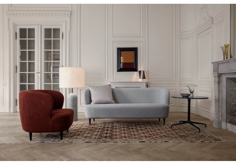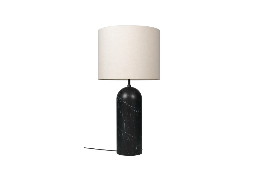 Gravity, von Space Copenhagen für Gubi entworfen, ist eine Tischlampe mit Sockel aus schwarzem Marmor, grauem Marmor oder Stahl und weißem oder Leinenschirm. Verfügbar in zwei Abmessungen. Lichtdimmer auf der Basis. Birne nicht enthalten.