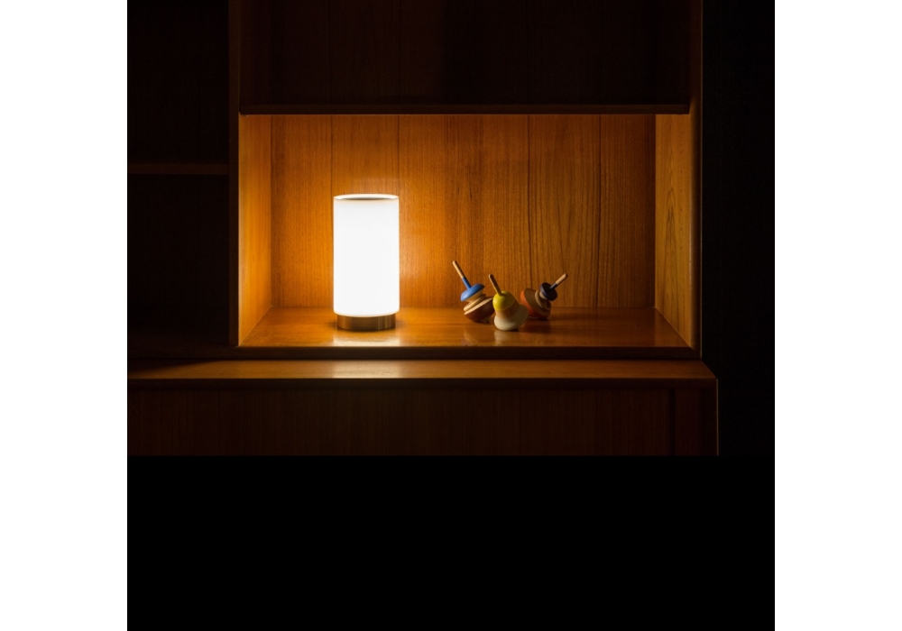 Bugia entworfen und hergestellt von Davide Groppi, ist eine wiederaufladbare Tischlampe mit einem zylindrischen Körper aus lackiertem Metall. Der Diffusor ist aus Methacrylat und schirmt eine LED-Lichtquelle ab.
