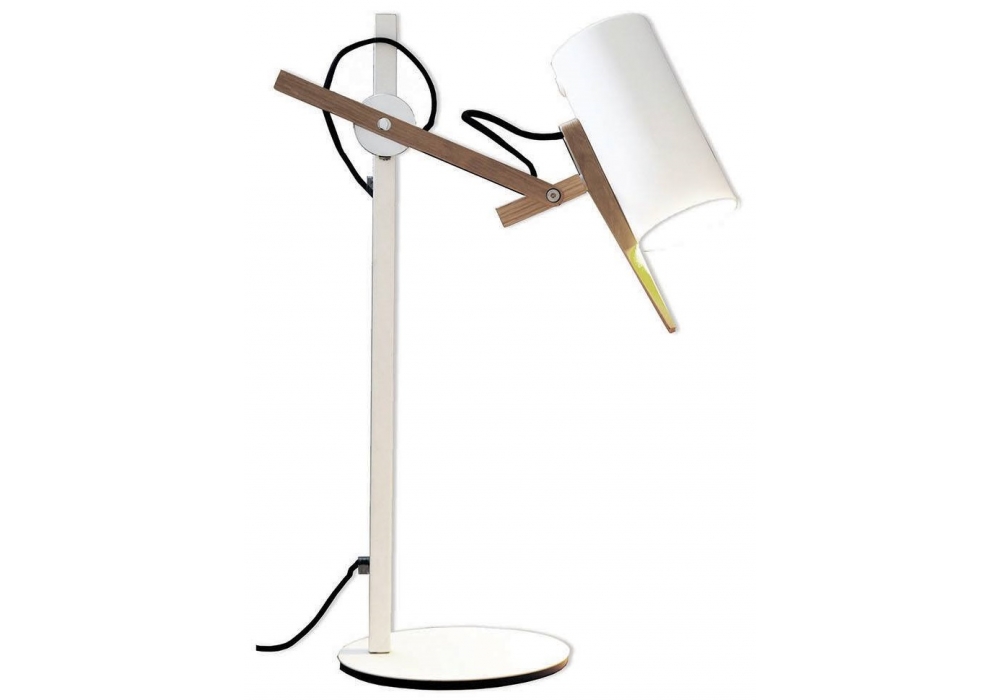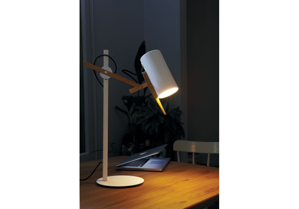 Scantling S von Mathias Hahn für Marset entworfen, ist eine Stehleuchte mit Struktur aus Eisen, Diffusor aus Aluminium und Arm aus Eiche. Sockel, Stiel und Diffusor sind in den Ausführungen Weiß oder Schwarz erhältlich.