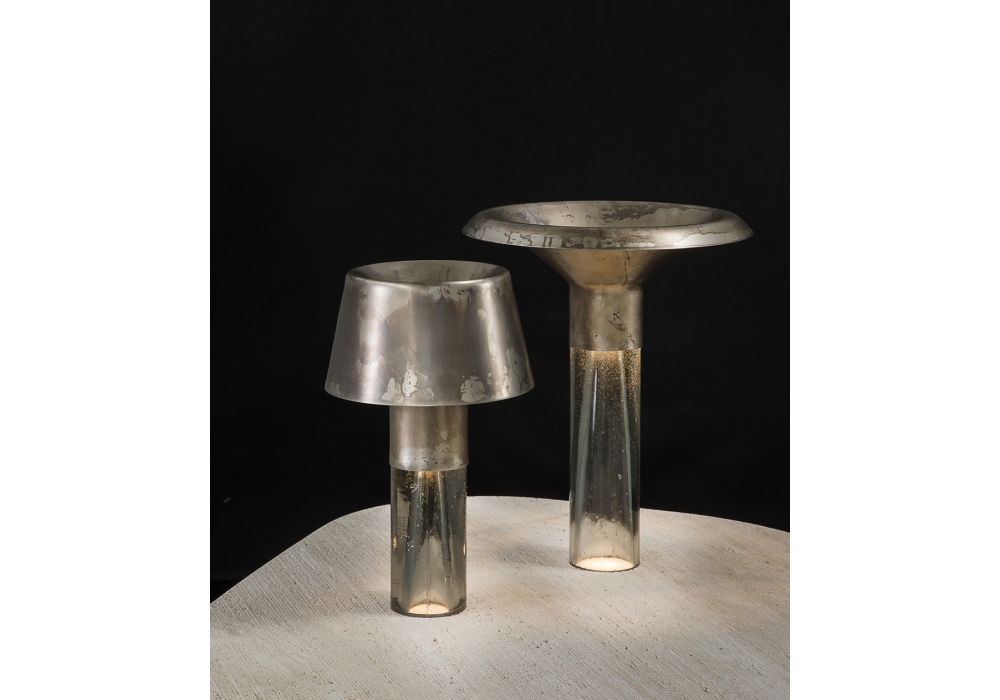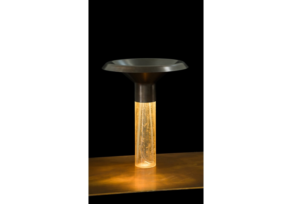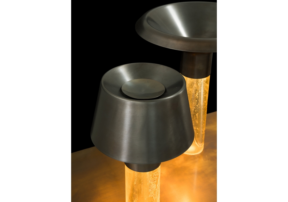 Ghost von Massimo Castagna für Henge entworfen ist eine Tischlampe mit einem zylindrischen zentralen Körper aus Harz und einem Diffusor aus lackiertem Stahl. Als Lichtquelle dient eine LED mit einem mit roter Seide umhüllten Kunststoffkabel mit Ein-/Ausschalter. Ghost ist verfügbar in verschiedenen Modellen, Ausführungen und Lichtabstufungen.