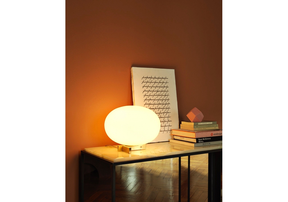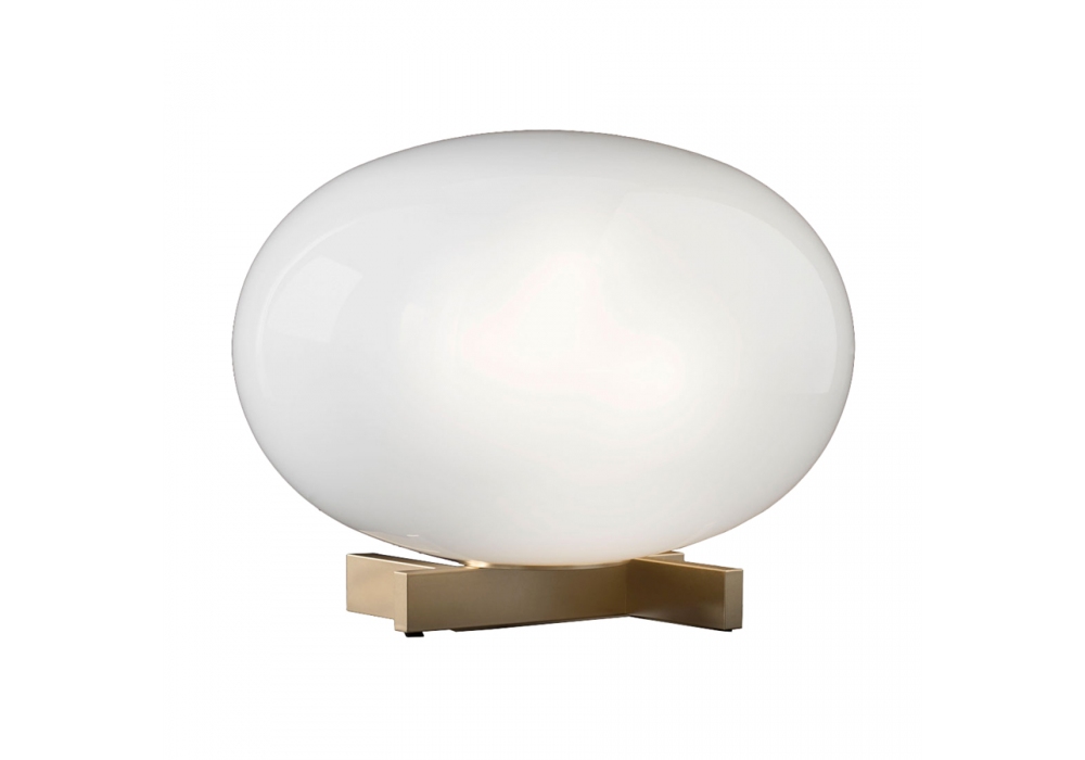 Alba conçue par Mariana Pellegrino Soto pour Oluce ist eine elliptische Tischlampe mit Sockel aus Metall und Satin. Der Diffusor ist ein opales Glas und schützt eine dimmbare Leuchtquelle.