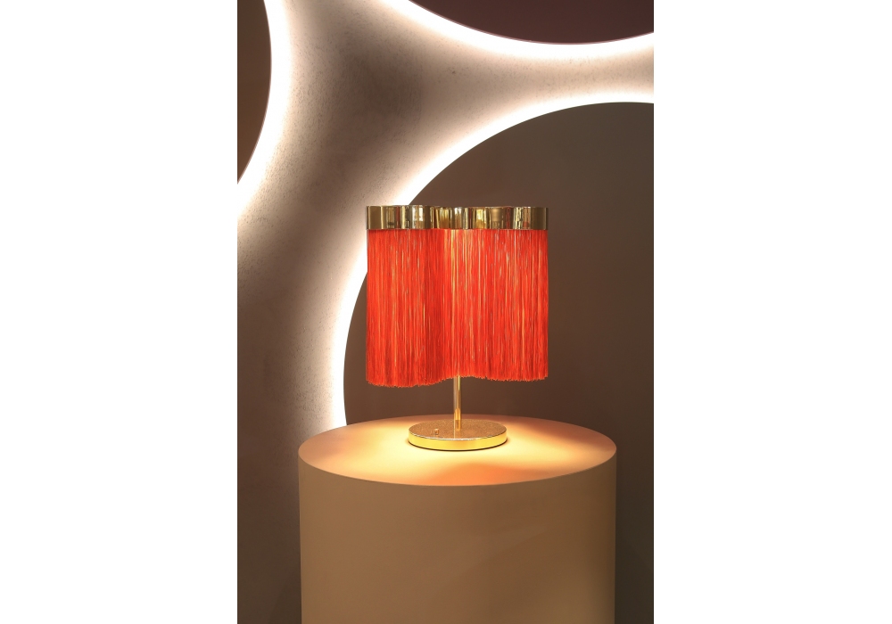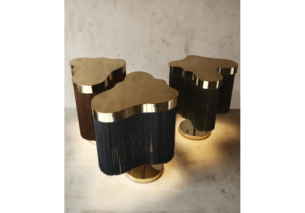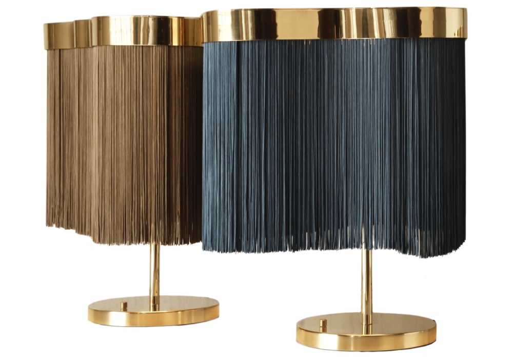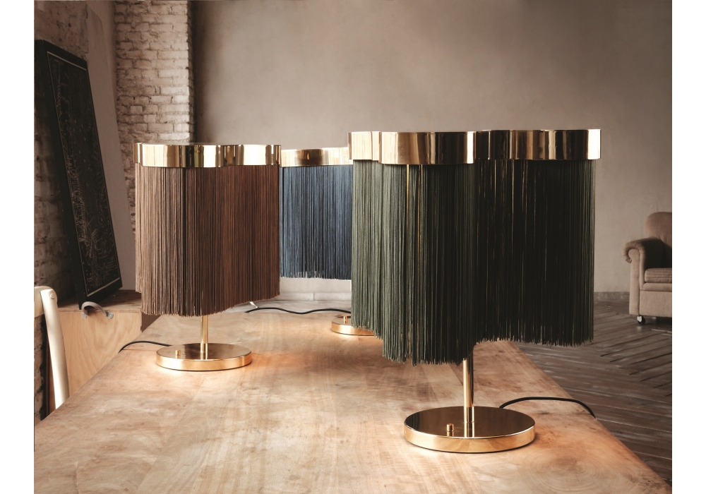 Arcipelago von Servomuto für Contardi entworfen ist eine Tischleuchte mit rundem Sockel und vertikaler Struktur aus poliertem Messing. Der Lampenschirm besteht aus Fransenstoff und schirmt eine LED-Lichtquelle ab. Arcipelago ist in verschiedenen Stoffausführungen erhältlich.