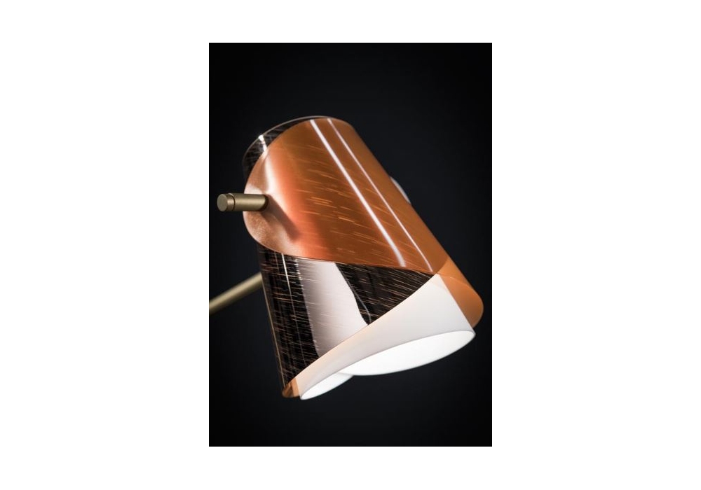 Overlay entworfen von Analogia Project für Slamp ist eine Tischleuchte die durch die Kombination von Messing, gebürstetem Copperflex® und Lentiflex strukturiert ist. Die verwendete Lichtquelle ist vom Typ LED. Overlay wird außerdem mit einem MontBlanc-Stift geliefert.