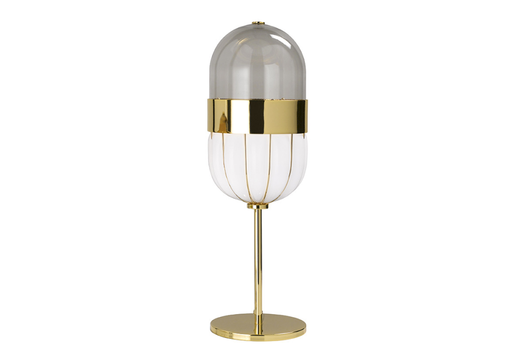 Pill 7237/L1 von Matteo Zorzenoni für MMLampadari entworfen, ist eine Tischleuchte mit Metallstruktur (24 Karat Gold) und Glasdiffusor, die in zwei Farbvarianten erhältlich ist.