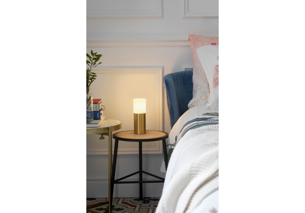 Lind von Augustin Gascòn für Aromas del Campo entworfen, ist eine Tischlampe mit Struktur aus mattem Messing und Alabaster-Diffusor.