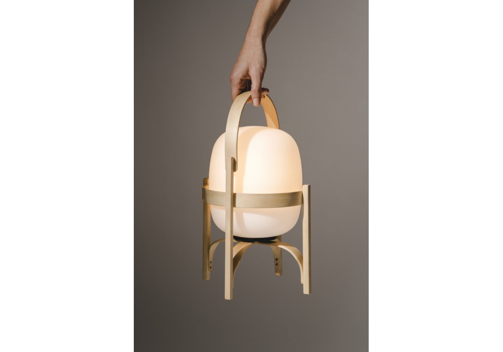 Cestita Batería von Miguel Milá für Santa&Cole entworfen, ist eine Tischleuchte mit weißem Opaldiffusor. Erhältlich in Glas oder Kunststoff. Struktur aus Kirschenholz. In die Leuchte integrierter Schalter mit 3 Intensitätsstufen, Lithium-Akku. Akku-Ladezeit: 6,5h.