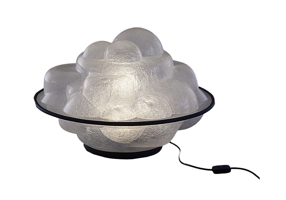 Profiterolle von Sergio Asti für Martinelli Luce entworfen, ist eine Tischlampe mit runder Basis aus schwarz lackiertem Metall. Der Diffusor ist durch eine Kombination aus Polyestermethacrylat und Glasfaser strukturiert und schirmt eine Lichtquelle des LED-Typs ab.