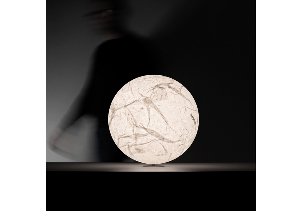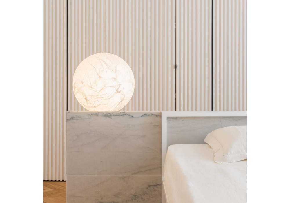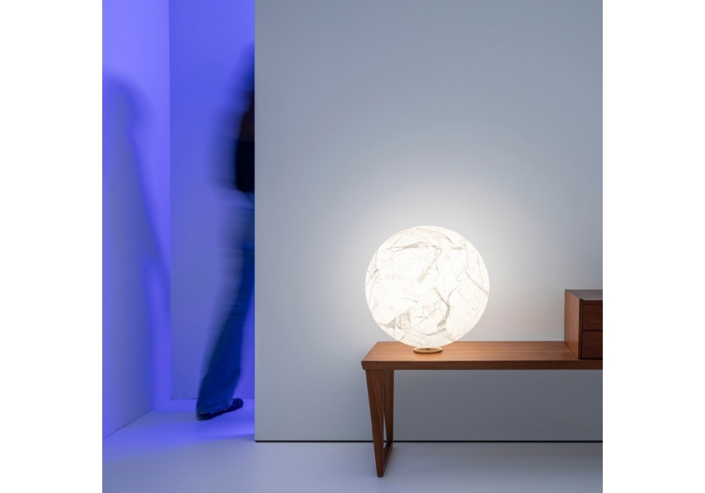 Moon T entworfen und hergestellt von Davide Groppi, ist eine kugelförmige Tischlampe, die von einem goldfarben lackierten Metallsockel strukturiert wird. Der Diffusor ist aus japanischem Papier strukturiert und schirmt eine Lichtquelle mit E27-Fassung vom Typ LED mit Dimmersystem am Netzkabel ab.