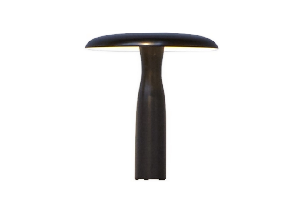 Kinoko von Mathieux Delacroix für Ligne Roset entworfen, ist eine Tischleuchte mit Lampenschirm in mattschwarz lackiertem Aluminium RAL 9005. Innenseite des Lampenschirms mattweiß lackiert RAL 9005. Stromkabel aus schwarzem PVC. Schwarzer Handschalter/Variator. 18 W LED-Modul.
