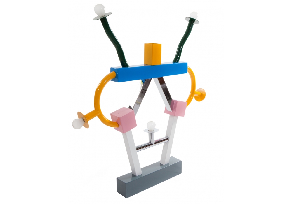 Ashoka von Ettore Sottsass für Memphis Milano entworfen, ist eine Tischleuchte mit feuerlackierter Metallstruktur.