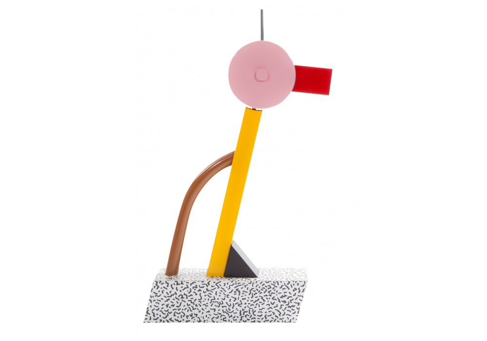 Tahiti von Ettore Sottsass für Memphis Milano entworfen, ist eine Tischleuchte mit einem drehbaren Kopf aus polychrom emailliertem Metall auf einem Sockel aus Kunststofflaminat mit schwarz-weißem Bacterio-Muster. LED-Lampe EU-Version 230V.