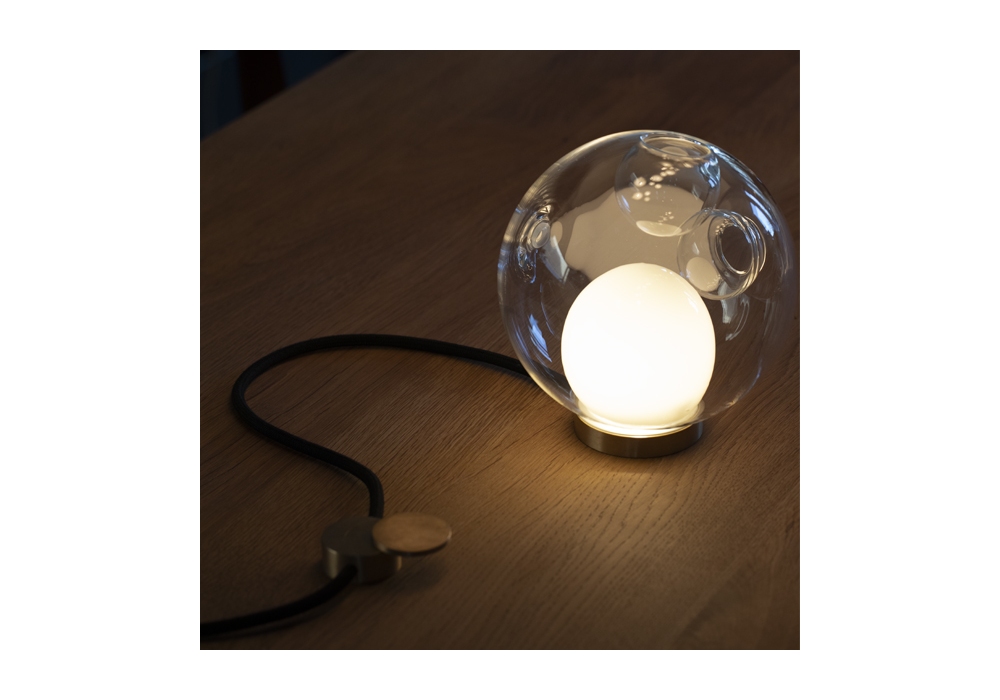 28t Clear von Omer Arbel für Bocci entworfen, ist eine Tischleuchte mit rundem Messingfuß und transparentem Diffusor aus mundgeblasenem Glas. Die Lichtquelle ist LED mit runder Messing-Zündsteuerung.