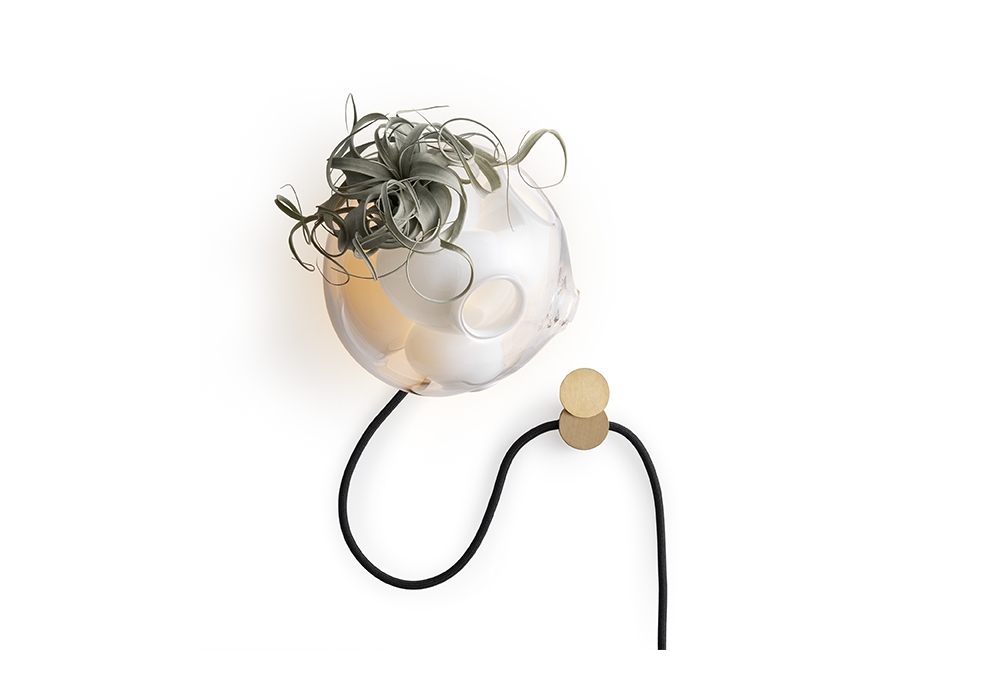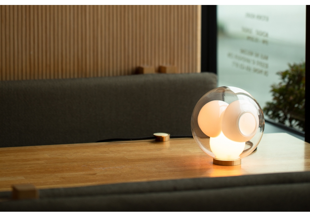 38Vt von Omer Arbel für Bocci entworfen, ist eine Tischleuchte mit rundem Messingfuß und transparentem Diffusor aus mundgeblasenem Glas. Die Lichtquelle ist LED mit runder Messing-Zündsteuerung.