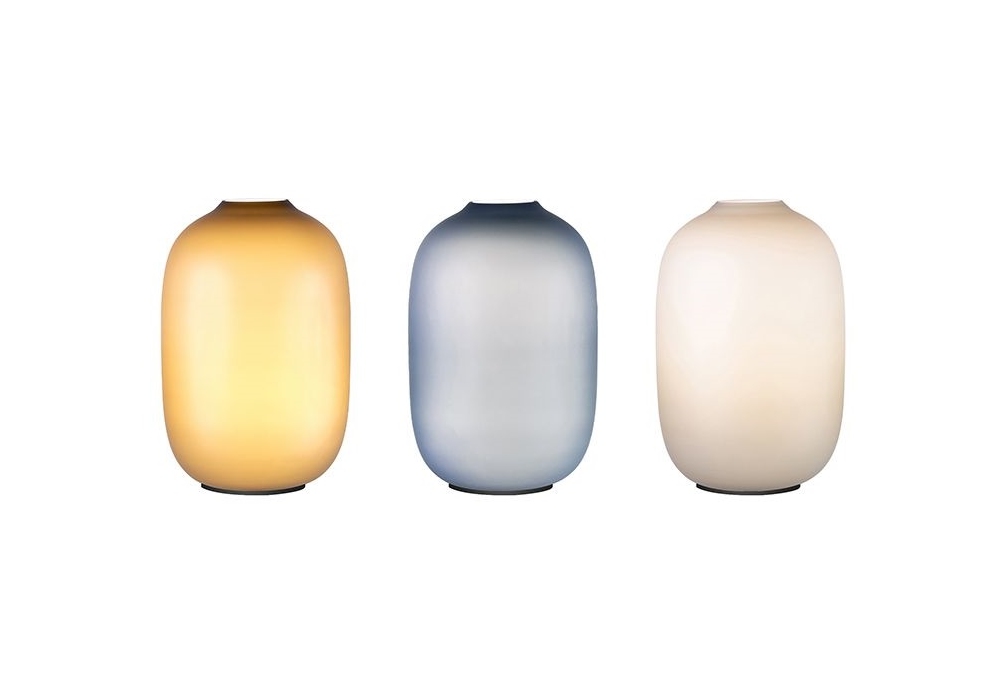 Arya von Giulio Cappellini & Antonio Facco für Cappellini entworfen, ist eine Tischleuchte aus matt schwarz lackiertem Metallrohr und -blech und undurchsichtigem farbigem Glasdiffusor. Verfügbar in mehreren Ausführungen und Abmessungen.