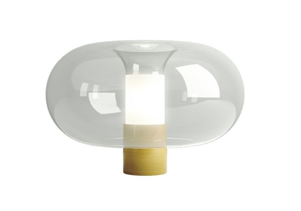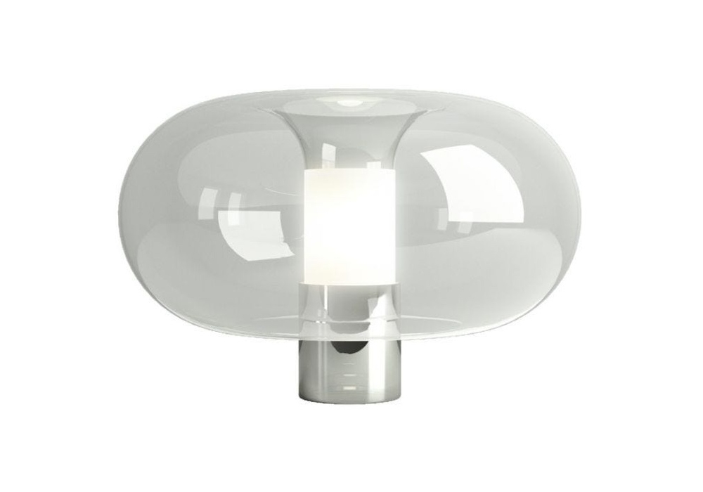 Fontanella von Federico Peri für Fontana Arte entworfen, ist eine Tischleuchte mit tragender Struktur und zylindrischem Sockel aus verzinktem Metall in den Ausführungen: Chrom, Schwarz oder Messing. Der Diffusor ist elliptisch aus transparentem mundgeblasenem Glas. Verfügbar in verschiedenen Abmessungen.