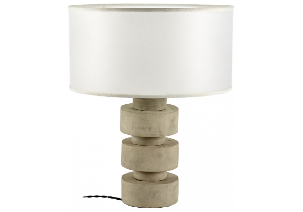 Disc Lamp von Marie Michielssen für Serax entworfen, ist eine Tischleuchte, der Sockel ist zylindrisch mit kreisförmigen Rillen verziert, das verwendete Material ist Beton in grauer Ausführung. Als Lichtquelle wird LED oder Halogen mit E27-Kupplung verwendet, abgeschirmt von einem leichten Stoffschirm.